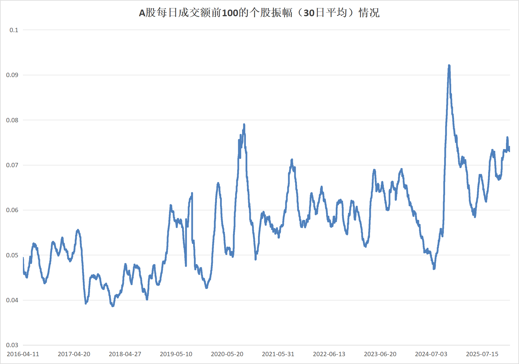 界面新闻统计了最近十年A股每日成交额前100个股的振幅(30日平均)情况,数据显示,上述指标的振幅中枢是在不断往上移动的,从2016年的约5%移动到当前的约7%,整体上移了大约2个百分点。这说明个股日内走势波动性加剧。