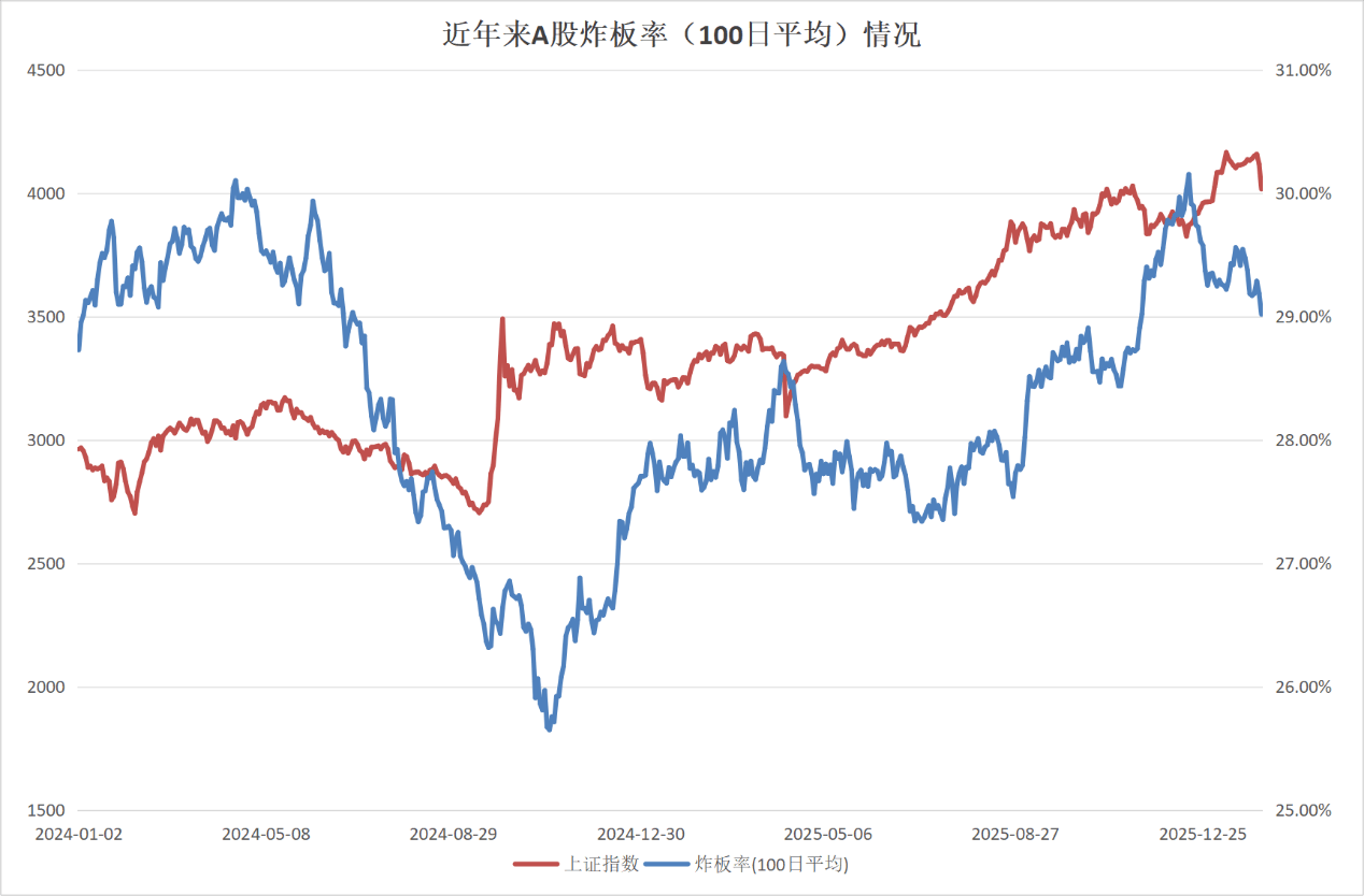 界面新闻进一步统计了2024年以来炸板率的100日平均情况,可以看出,在2024年11月份的“疯牛”行情结束以后,市场的炸板率是在不断升高的,说明短线投机的波动越来越大。
