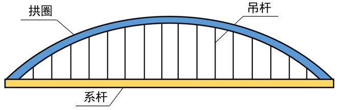 系杆拱桥传力路径清晰,桥面荷载通过横梁传递到系梁,系梁连接吊杆与拱圈,通过吊杆将力传递到拱圈,形成拱圈受压,系梁受拉的受力特点,具有结构刚度大、力学性能高效、跨度大和美观的优势。系杆拱结构示意图如图5所示。