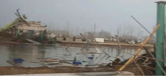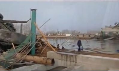 由仅有的现场视频分析来看,主桥结构已全部塌落,拱肋、系梁等构件残骸落入水中,仅有部分吊杆、钢管骨架外露,事故发生时西侧主桥拱脚停有大型货车,事故发生后该混凝土泵送车均发生侧翻,西侧拱脚处合龙段临时支撑、盖梁、桥面板均已倒塌,东侧临时支撑、盖梁保存完好,部分拱肋横撑坠落于主桥东侧,如图9所示。