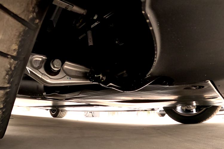 底盘方面,从前到后,十分平整,处理的很好。前悬架是双叉臂式,从这个角度看过去,至少下臂似乎是铝合金材质。