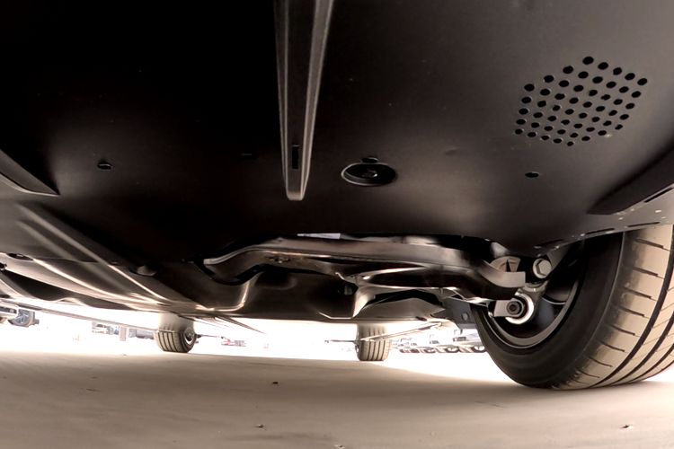 后悬架是多连杆式,下臂貌似也是铝合金材质。由于底盘进行了全覆盖,位于后桥的驱动电机,几乎一点儿都看不到。